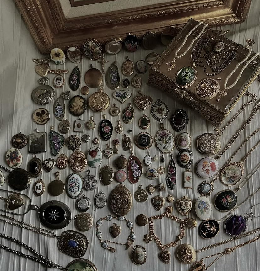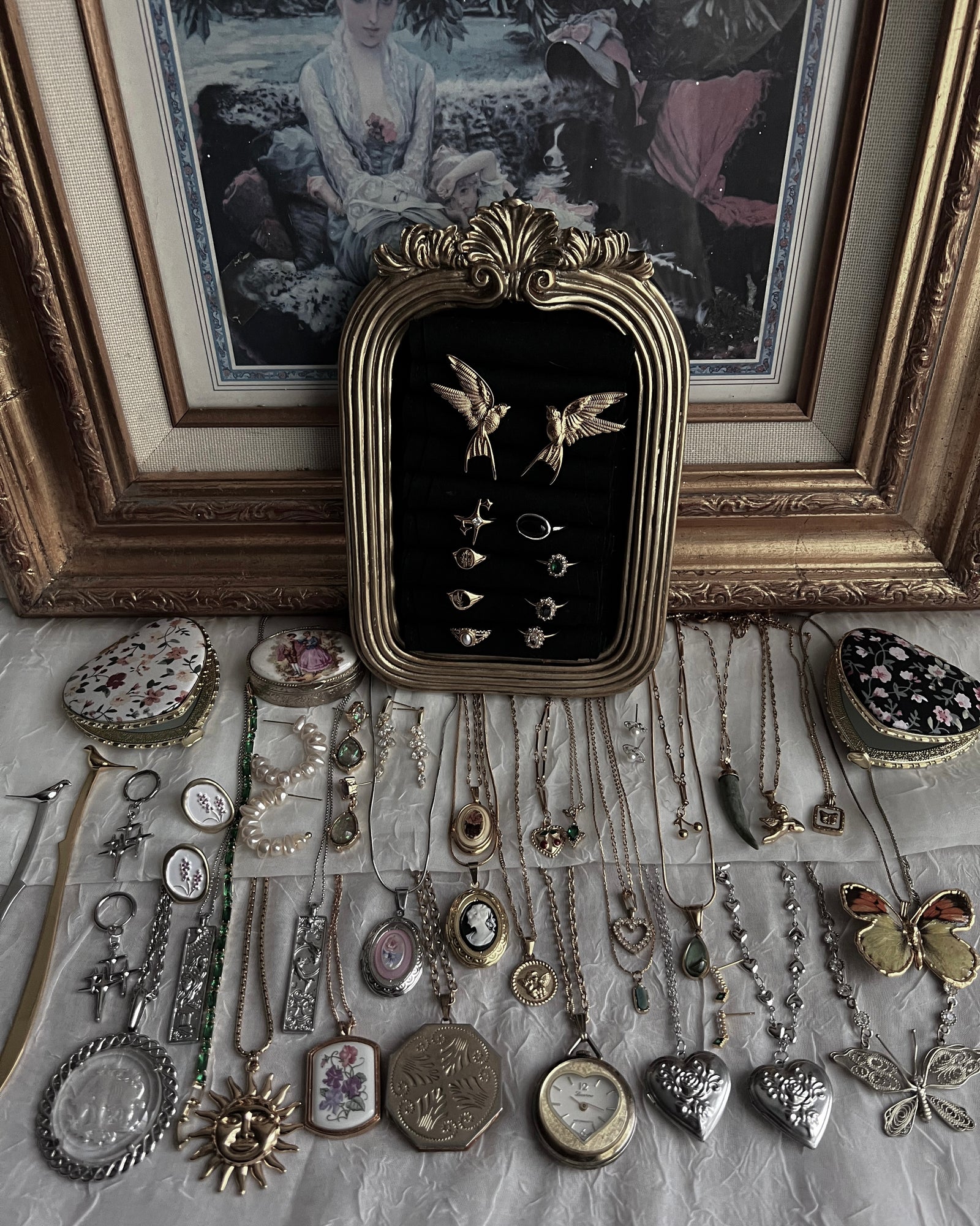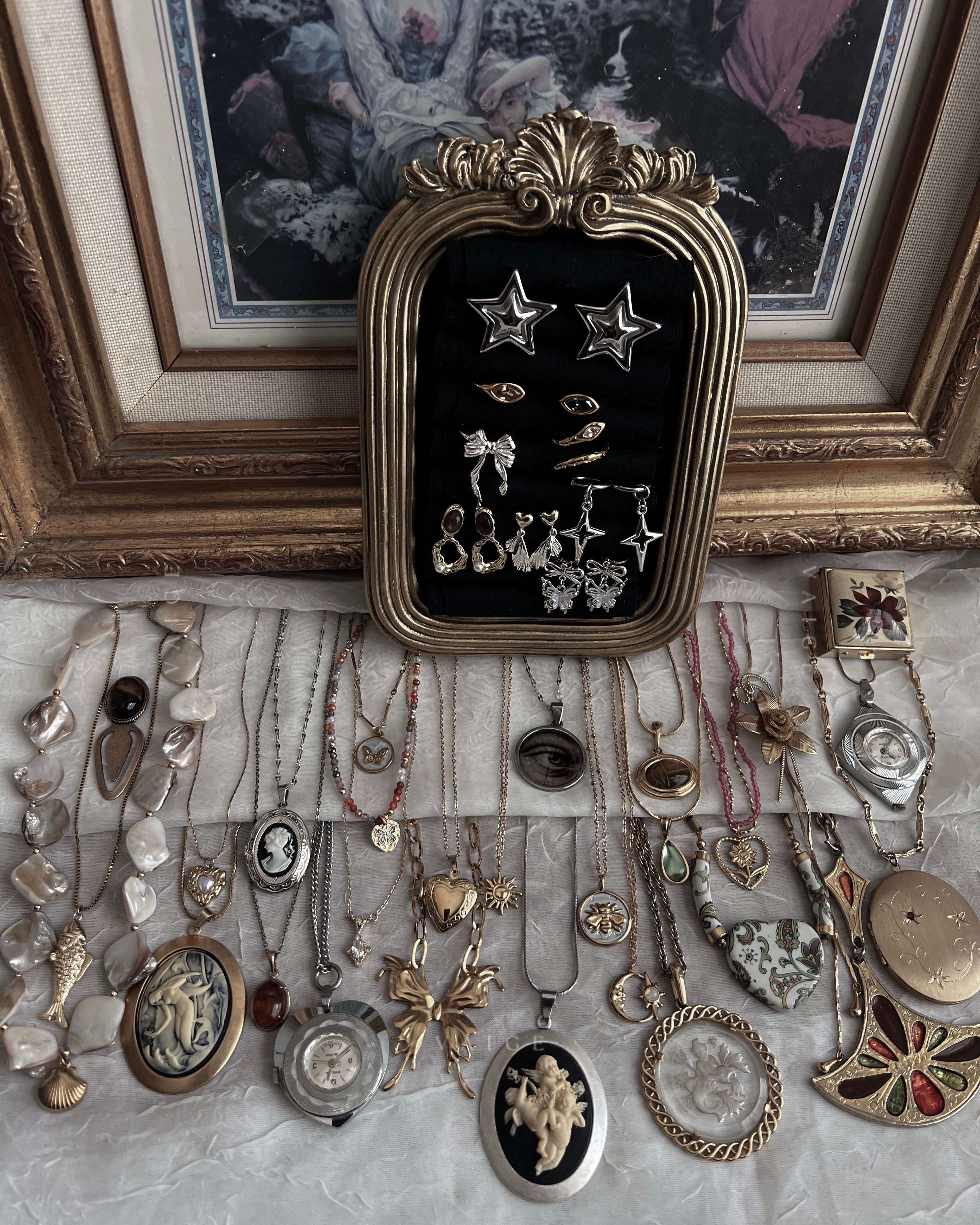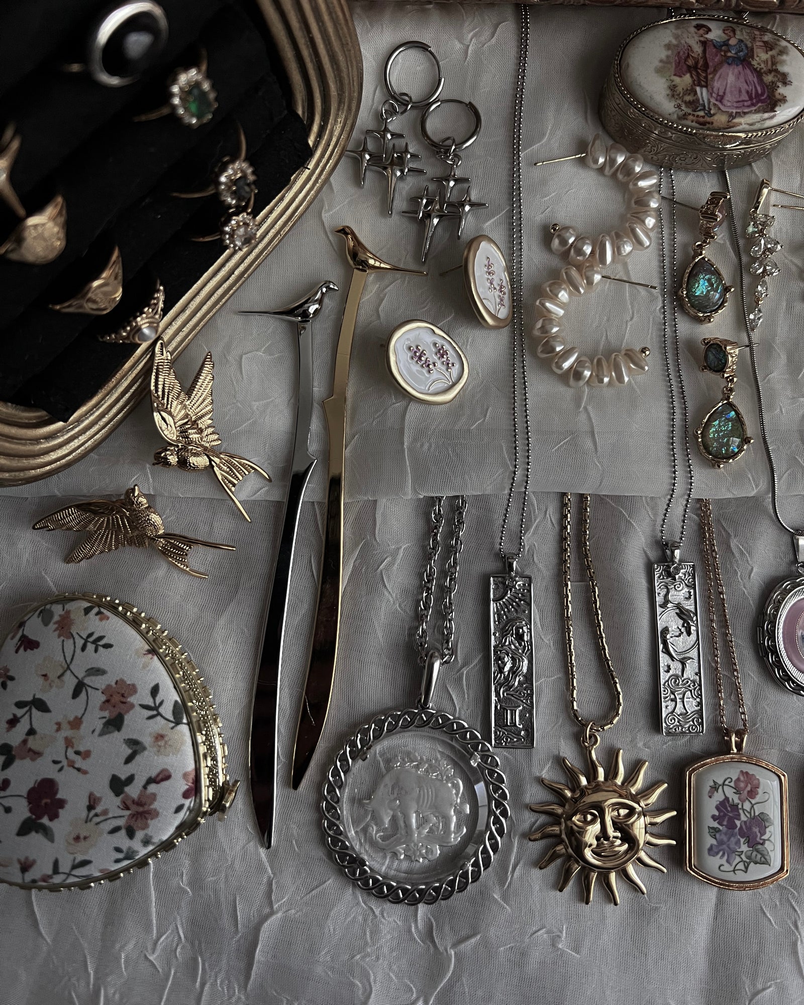 Bags & wallets, hair clips, belts, compacts & jewelry box.