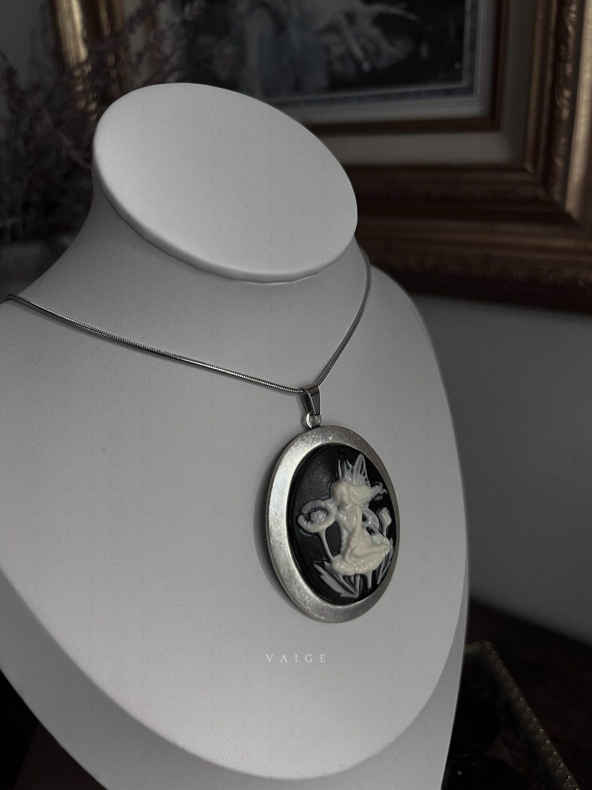 This exquisite necklace features a stunning fairy on a flower cameo, beautifully crafted from durable stainless steel, ensuring longevity and shine. The intricate design showcases delicate details, making it a perfect addition to any collection.